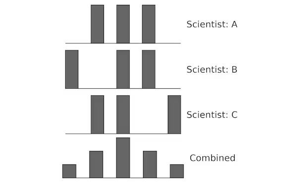 3人の科学者がそれぞれ3つの測定値を測定したとします。個別に見ると、測定値はランダムに見えるかもしれませんが、偏りのない測定値をまとめると、中央値、つまり平均値を中心に均等に分布します。
